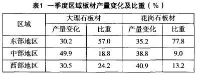 从区域看,中部地区规模以上石材企业板材产量增幅居前,所占比重远低于东部,也低于西部地区;西部地区规模以上企业花岗石板材产量增幅领先其他地区。重点省份中,广西(花岗石板材55.9%)、广东(大理石板材51.8%)、河南(花岗石板材107.7%)增幅居前。见表1。