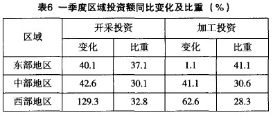 2012年一季度,规模以上石材企业建筑装饰用石开采投资累计41亿元,比上年同期增长61.6%;建筑装饰用石加工投资累计101亿元,比上年同期增长25.4%。从区域看,东部地区加工业投资增速放缓,加工投资仅比上年同期增长1.1%;西部地区加工及开采投资高速增长,分别达62.6%和129.3%,远远领先其他地区,未来,随着西部产能的释放,西部地区承接产业转移的步伐及水平将有较大提高。中、西部地区投资比重不断提高,逐渐缩小了与东部地区的差距。与去年同期相比,一季度,广西、湖北、福建、陕西四省开采投资增幅超过100%;河南、云南、甘肃、河北(195.7%)四省开采投资接近或超过200%;广东、安徽两省则分别下降22.9%和31.9%。广西、安徽、甘肃、重庆加工投资增幅超过100%;河南、湖南、河北、云南、吉林投资增幅超过40%;四川、天津则分别下降21.5%和63.1%。见表6。