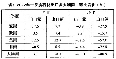 2012年一季度,石材出口570万t,同比增长14.4%,环比下降7.9%;出口额为10.2亿美元,同比增长8.4%,环比下降32.1%。从出口结构看,加工及制成品出口数量为212万t,同比下降2.2%,环比下降20.1%;出口额为9.4亿美元,同比增长8.0%,环比下降32.7%。加工及制成品占出口总量的37.2%,同比下降6.3个百分点;占出口总额的92.4%,同比下降0.4个百分点。