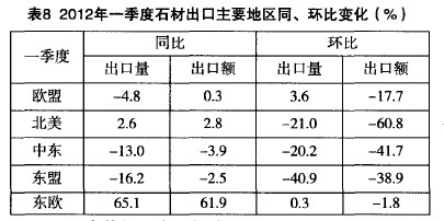从主要地区的出口变化看,对北美、中东及东盟的出口量、值环比大幅下降;除中东及东盟的出口量、值同比明显下降。从环比变化看,出口额降幅普遍高于出口量降幅(东盟除外);从同比变化看,出口额的增幅普遍高于出口量增幅(东欧除外),出口额的降幅低于出口量的降幅。见表7、表8、表9。
